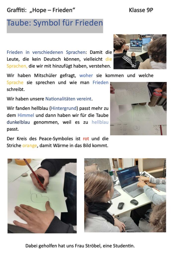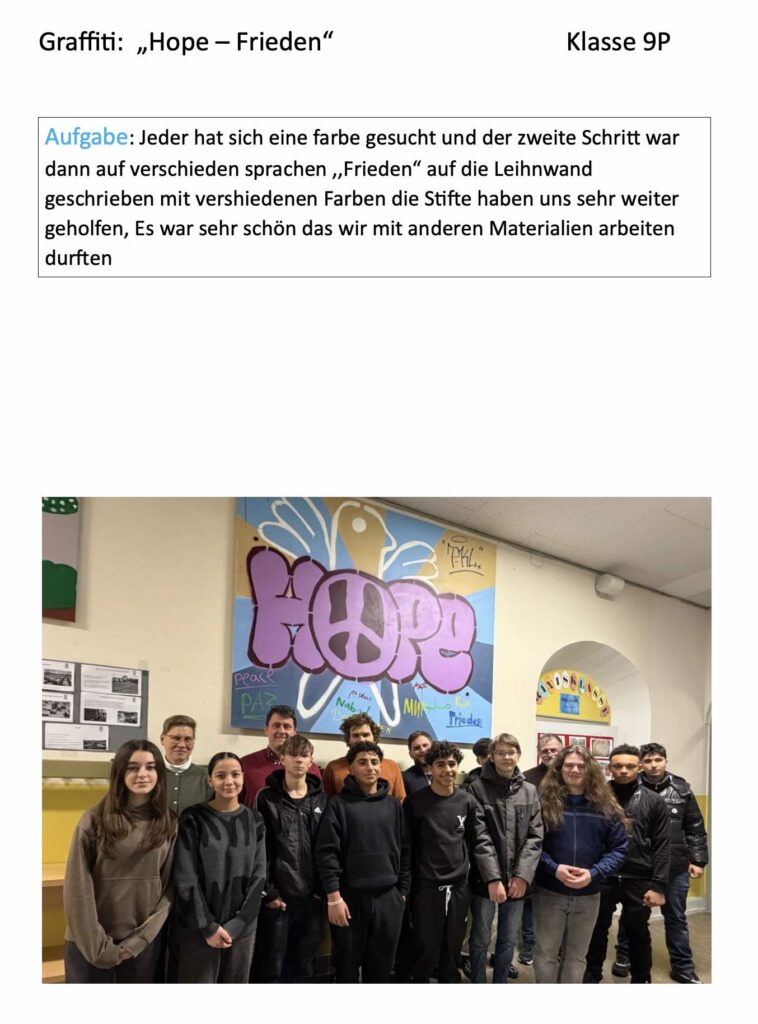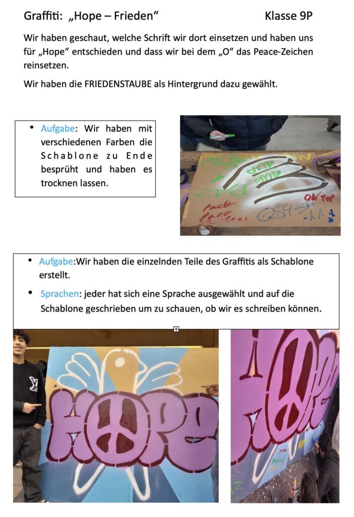 Ein zweiter wichtiger Teil unseres Projektes war ein Graffiti zum Thema „Hope“ – Frieden. Dieses Thema haben wir bewusst gewählt, weil es für unsere Klasse eine besondere Bedeutung hat. In unserer Klasse kommen Schüler und Schülerinnen aus verschiedenen Ländern zusammen, in denen Krieg oder Konflikte herrschen: Zum Beispiel aus Afghanistan, der Ukraine, Somalia und Syrien. Der Grund warum wir das alles gemacht haben war, weil wir mit dem Graffiti ein Zeichen setzen wollten, dass Zusammenhalt, Teamarbeit und Frieden nicht nur für unsere Klasse besonders wichtig sind.